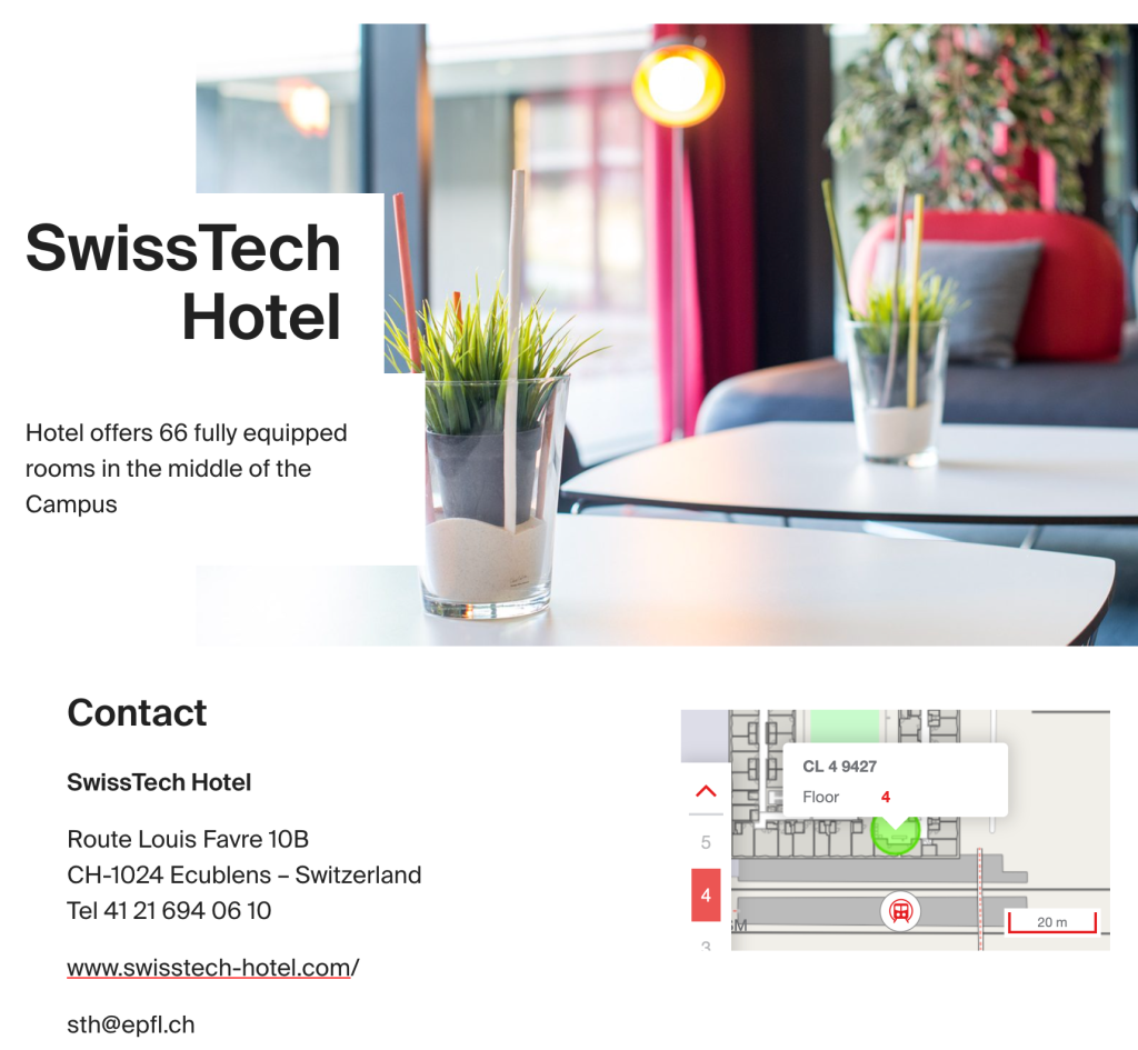 SwissTech Hotel (***), CHF 125 / night, directly next to the conference location at the SwissTech Convention Center.