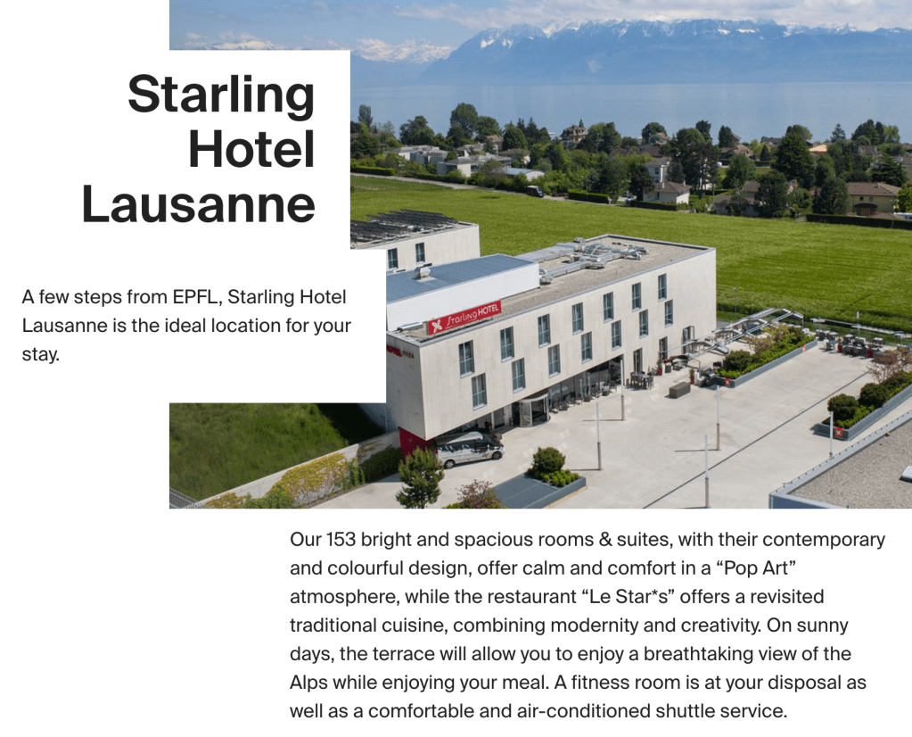 Starling Hotel (****), CHF 179 / night, 10 min. walk to the SwissTech Convention Center, closer to the Geneva lake.